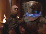 | SG基地に、SG1の信号をキャッチする、しかしSG1のメンバーは全員居る。ということは、前回マスターブレイタクに渡していた発信機を使って地球にやってきたのだ、それは緊急のときしか使わないという条件であったため、慌てるSG基地。それはティルクの息子ライアックがアポフィスに捕まってしまったとのことだ。緊急で会議を開いたSG基地では救出に向かうために、SG1を派遣する。そして、ブレイタクに連れられてある家に向かう。そして、妻ドレイアックとの再会をする。しかし実は彼女はティルクのライバルであるフロタクと一緒に住み何と婚約も解消していた。そして、ティルクを愛してはいたのだが、奴隷と化した彼女たちが生き延びるためには、地位の高いフロタクとの生活が望ましいと判断したのである。 |